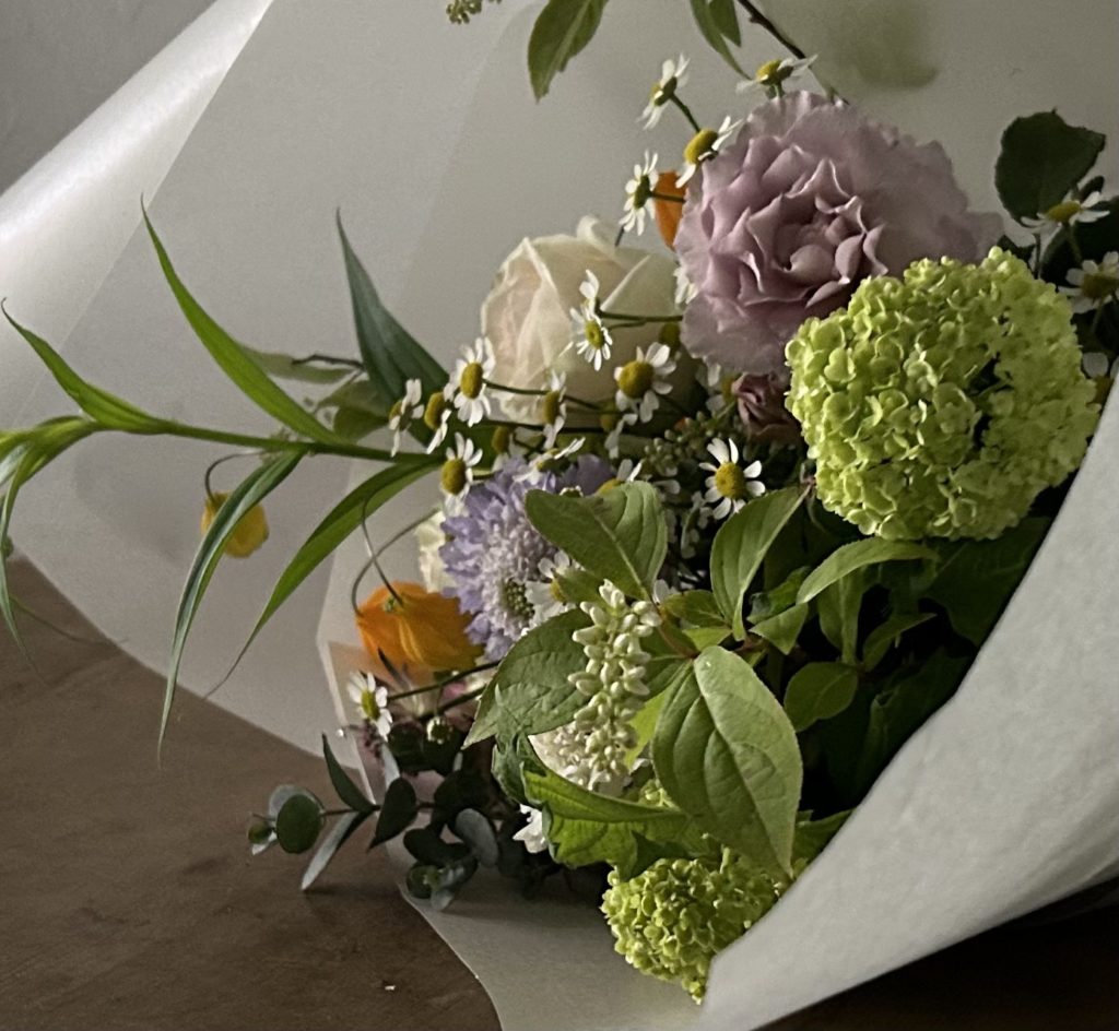 バラやガーベラ、ダリア、スカビオサ、ビバーナム、ユーカリなど、春の草花や枝モノを使って、春を感じるやわらかいブーケを作ります。